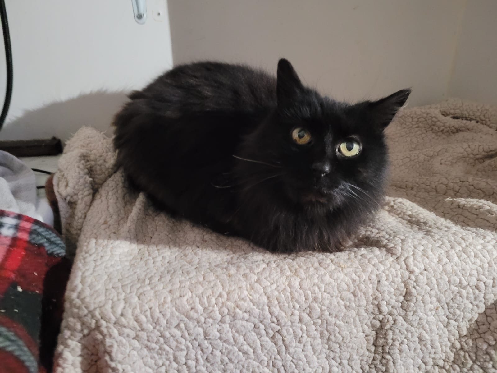 Shy at first, Fluffy (yes, she is the black, hairy one with the golden flecked eyes !) prefers to review the situation before coming out to say hello and give you a fuss.